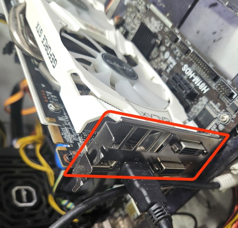 아래 사진처럼 빨간 네모안의 그래픽카드 출력단자 중 사용할 단자에 케이블을 연결해주세요.