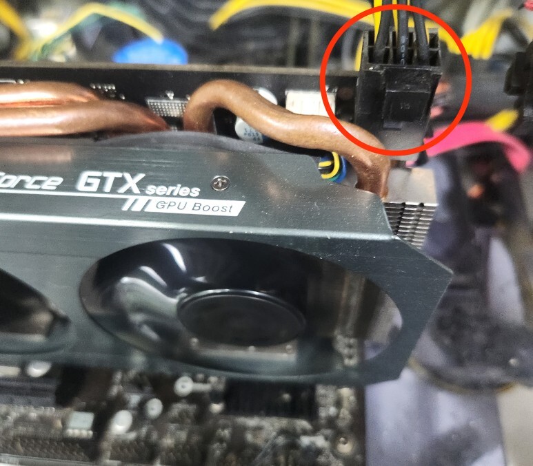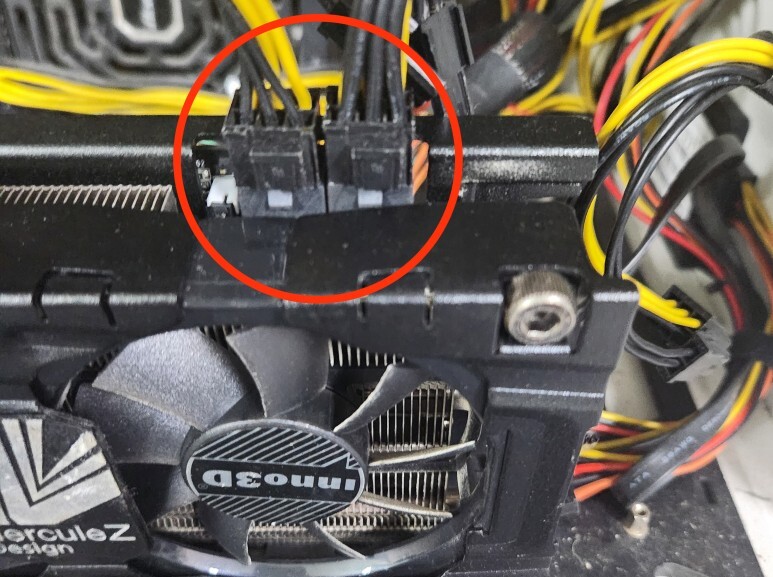 위 빨간 네모 안의 쿨러주변에 다른 선이 닿지 않게 주의해주세요. 쿨러파손의 원인이 될수 있으며, 혹은 쿨러가 돌아가는걸 방해해서 그래픽카드 불량을 유발할수도 있습니다.