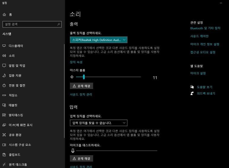 - 스피커 전원이 켜져있는지, 볼률이 크게 조정이 되었는지 확인합니다.