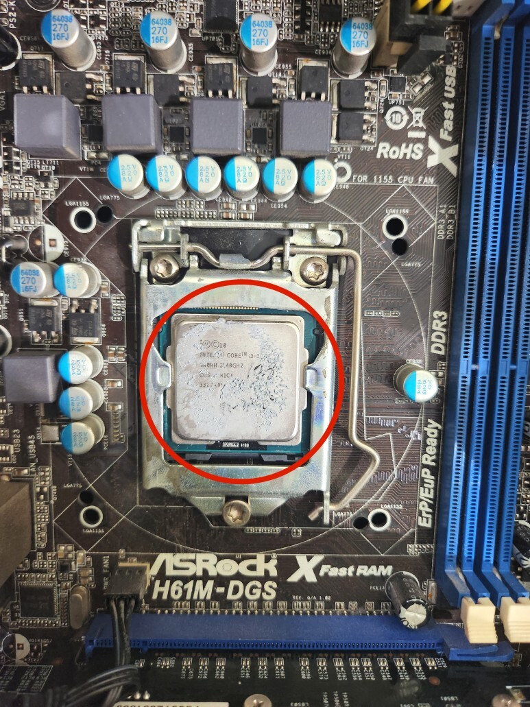 CPU는 쿨러에 가려져서 쿨러를 제거하지 않으면 볼수 없습니다.