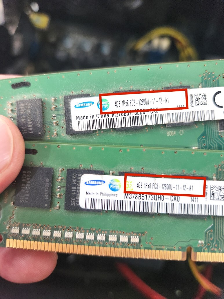 해당 메모리는 DDR3 4G PC3-12800U 제품이네요. 두개가 장착되있구요. 메인보드에도 2개를 장착할수 있도록 2개의 소켓이 있네요.