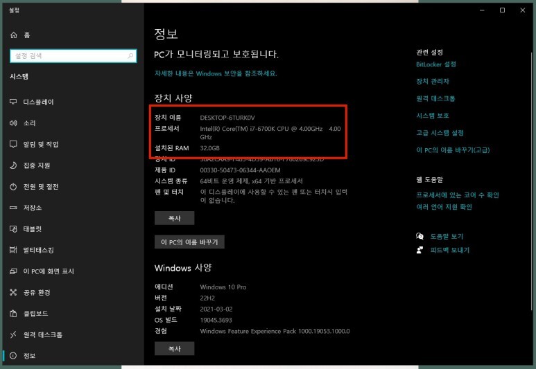 내 컴퓨터의 CPU와 메모리(전체 램)의 정보를 확인가능합니다.